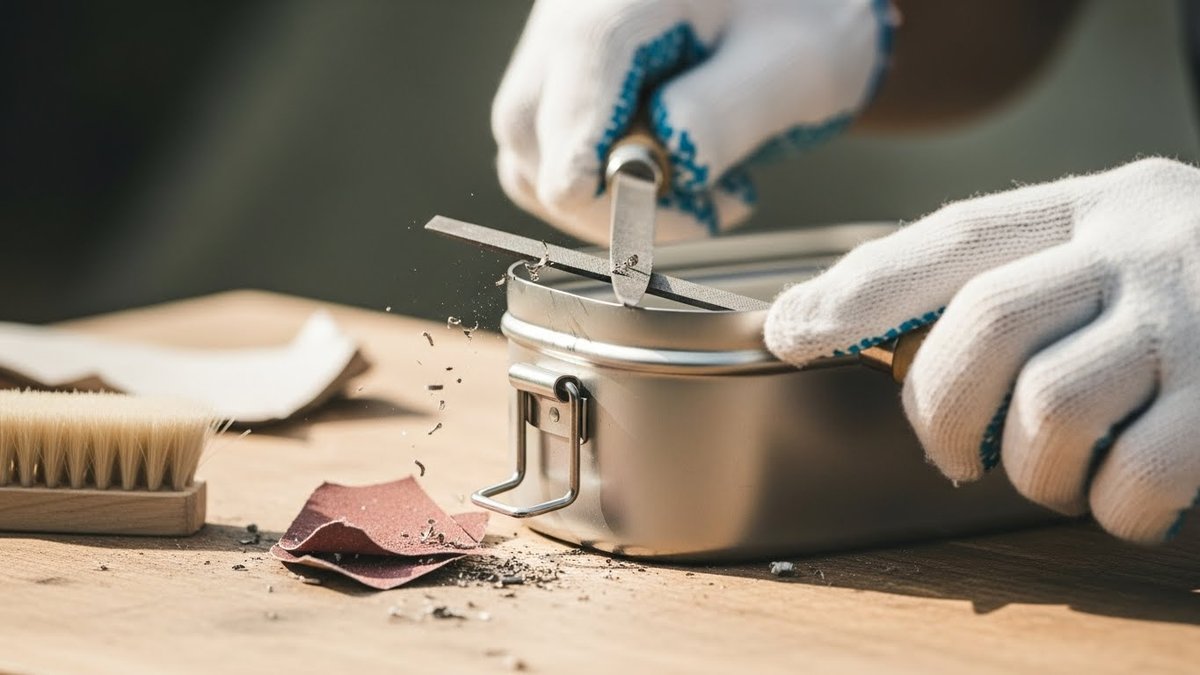 手早く終えるには流れを決めておくことが大切です。まず安全装備を整え、メスティンを固定します。次に粗い番手で大きなバリを落とし、形を整えます。続けて中〜細かい番手で段階的に磨き、触って引っかかりがないことを確認します。