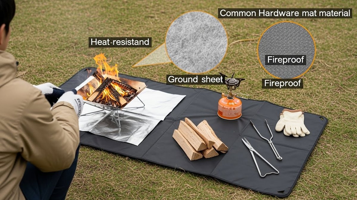 高温が長時間続く焚き火、大きな薪を直接乗せるような使い方、火がはねやすい油分のある燃料を使う場面では代用品は危険です。特に可燃性の繊維製品や薄いプラスチックシート、ペラペラのゴムシートは避けてください。